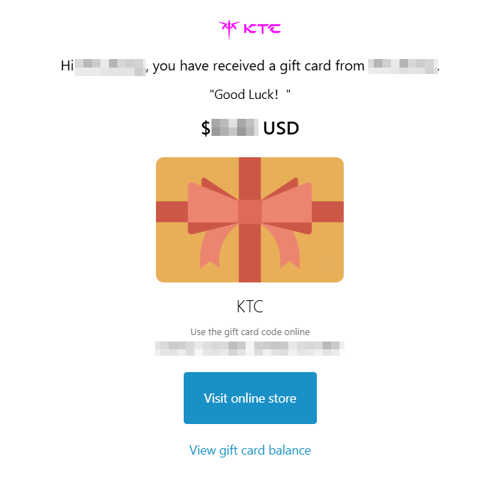You will receive an email from a KTC gift card. The email contains a link to check the balance. You can copy this gift code to the checkout page for use.